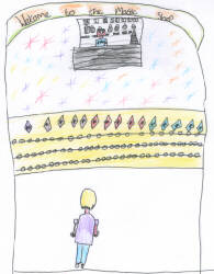 the magic shop. You enter the magic shop. As you walk into the shop you can smell the horrible smell even worse. There are lots of different things to see. There is a big gold trunk across the room with lots of pearls and diamonds going all around the trunk. There is a big counter with lots of wizard's hats, wands and anything else wizards need. |
