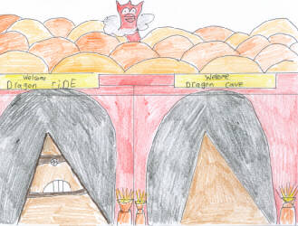 | You are in the horrible scary dragon's cave. The dusty, scary cave has a lot of pictures of dragons on the walls. There are cobwebs on the ceiling and it is very hot in there. The dragon is supposed to be breathing fire onto you. But he is not. You can't see one. | ||