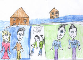 | The performance is about to start but you decide not to stay. Suddenly, looking around, you see your mum and dad. You don't know what to do. You see a big metal door. You pull a handle and a noisy flashing light goes off and on and a security guard arrives. You run out of the door and stand outside. You are outside the theatre. People are getting off the tram that is here. You think the security guard is going to get you. | ||